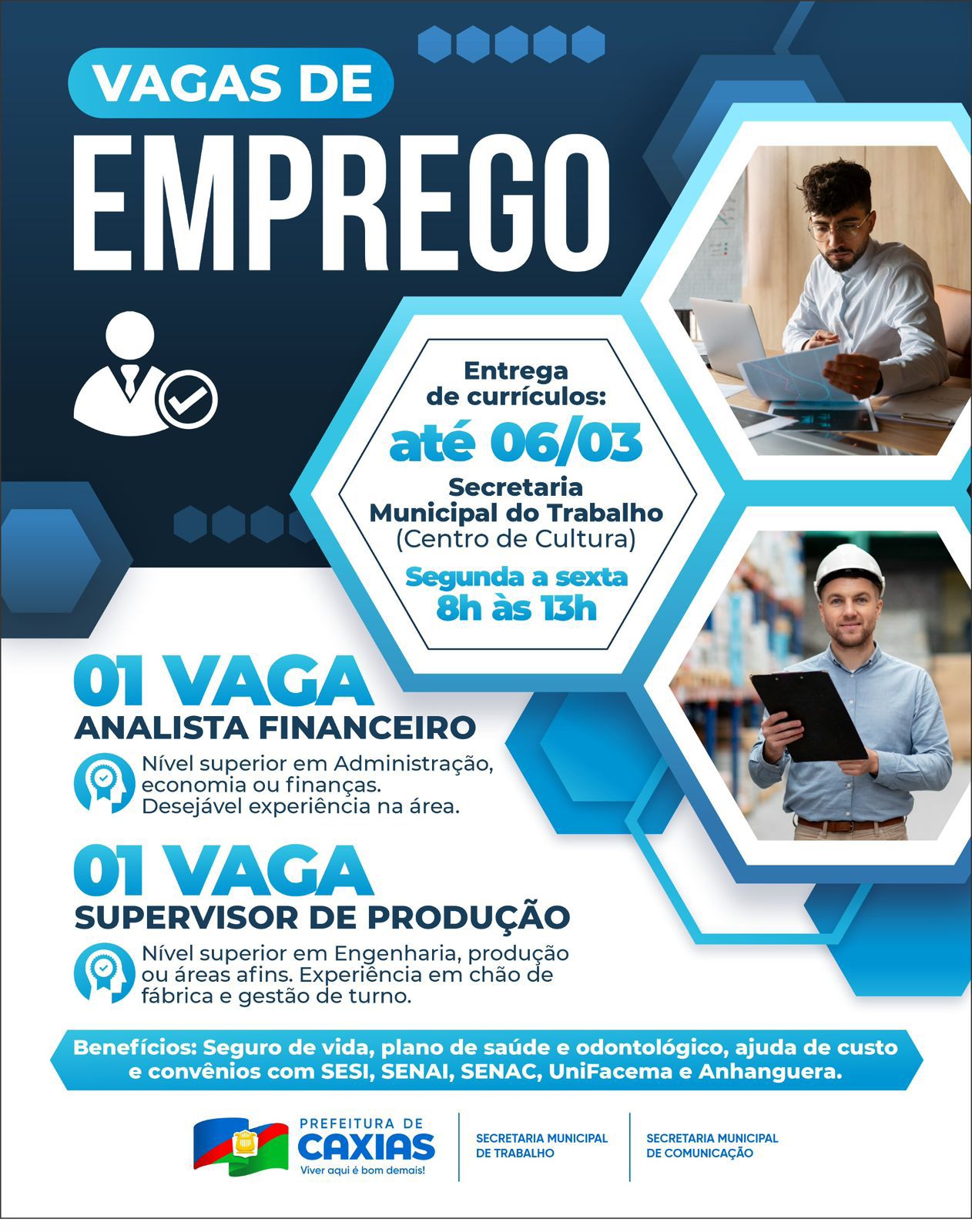 • 🚀 Oportunidade batendo à sua porta!O mercado de trabalho está em movimento e essa pode ser a chance de dar o próximo passo na sua carreira. 💼✨Cadastro de currículos na Secretaria Municipal do Trabalho, no Centro de Cultura, até o dia 06 de março.Não deixe para depois. Seu próximo desafio pode começar agora! 🤝#VagasDeEmprego #PartiuTrabalho #PrefeituraDeCaxias