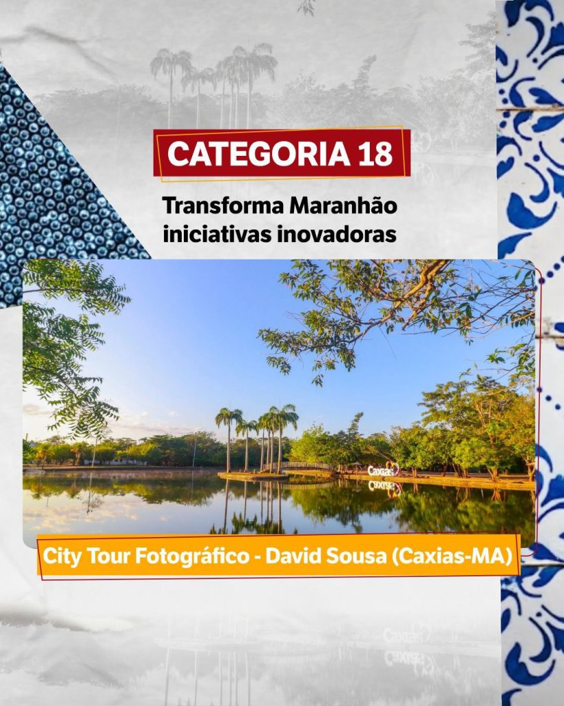 Outro importante reconhecimento vem na Categoria 18 – Transforma Maranhão: Iniciativas Inovadoras, com o City Tour Fotográfico David Sousa, uma proposta criativa que une turismo, arte e inovação, promovendo Caxias por meio de um olhar sensível e contemporâneo sobre seus espaços urbanos e históricos.
