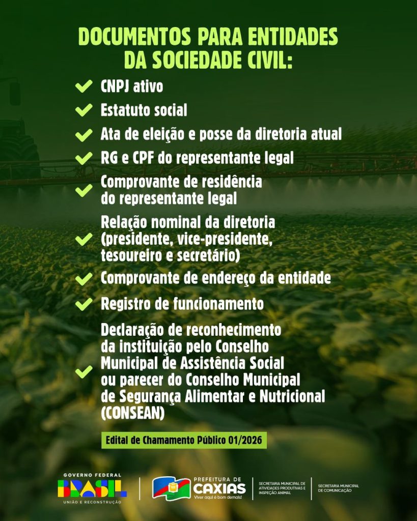 A Prefeitura informa que estão abertas, de 26 de janeiro a 03 de fevereiro de 2026, as inscrições para o Programa de Aquisição de Alimentos (PAA). Os interessados devem se dirigir à sede da Secretaria Municipal de Atividades Produtivas e Inspeção Animal, localizada na Avenida Volta Redonda, nº 1600, Bairro Volta Redonda, dentro do prazo estabelecido.