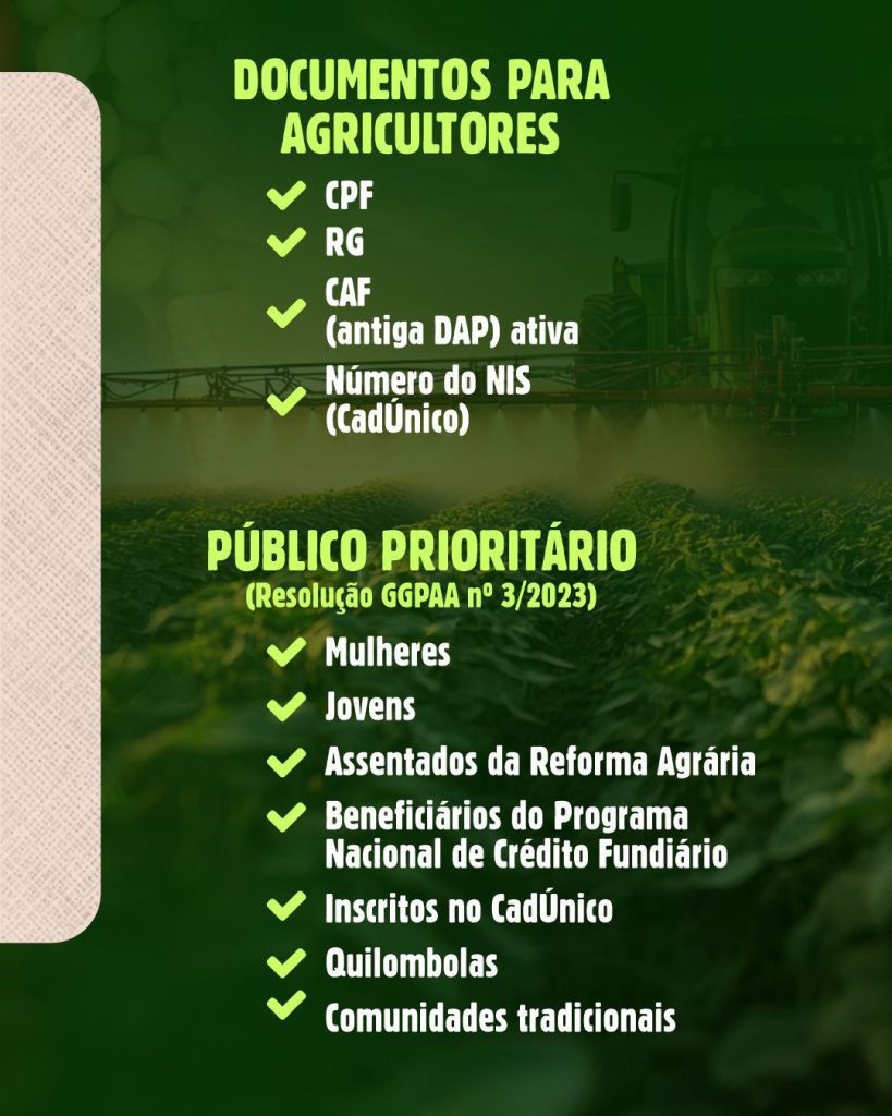 DOCUMENTOS – No ato da inscrição, os agricultores familiares devem apresentar os seguintes documentos: RG, CPF, CAF (antiga DAP) ativa e número do NIS (CadÚnico). O PAA tem como objetivo fortalecer a agricultura familiar, promover a geração de renda no campo e garantir alimentos de qualidade para a população.