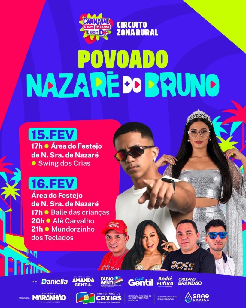 17h – CIRCUITO ZONA RURAL – A programação também contempla a Zona Rural, com o Circuito Zona Rural no Povoado Nazaré do Bruno. A partir das 17h, acontece o Baile das Crianças, seguido dos shows de Alê Carvalho e Mundozinho dos Teclados, garantindo diversão para toda a família.